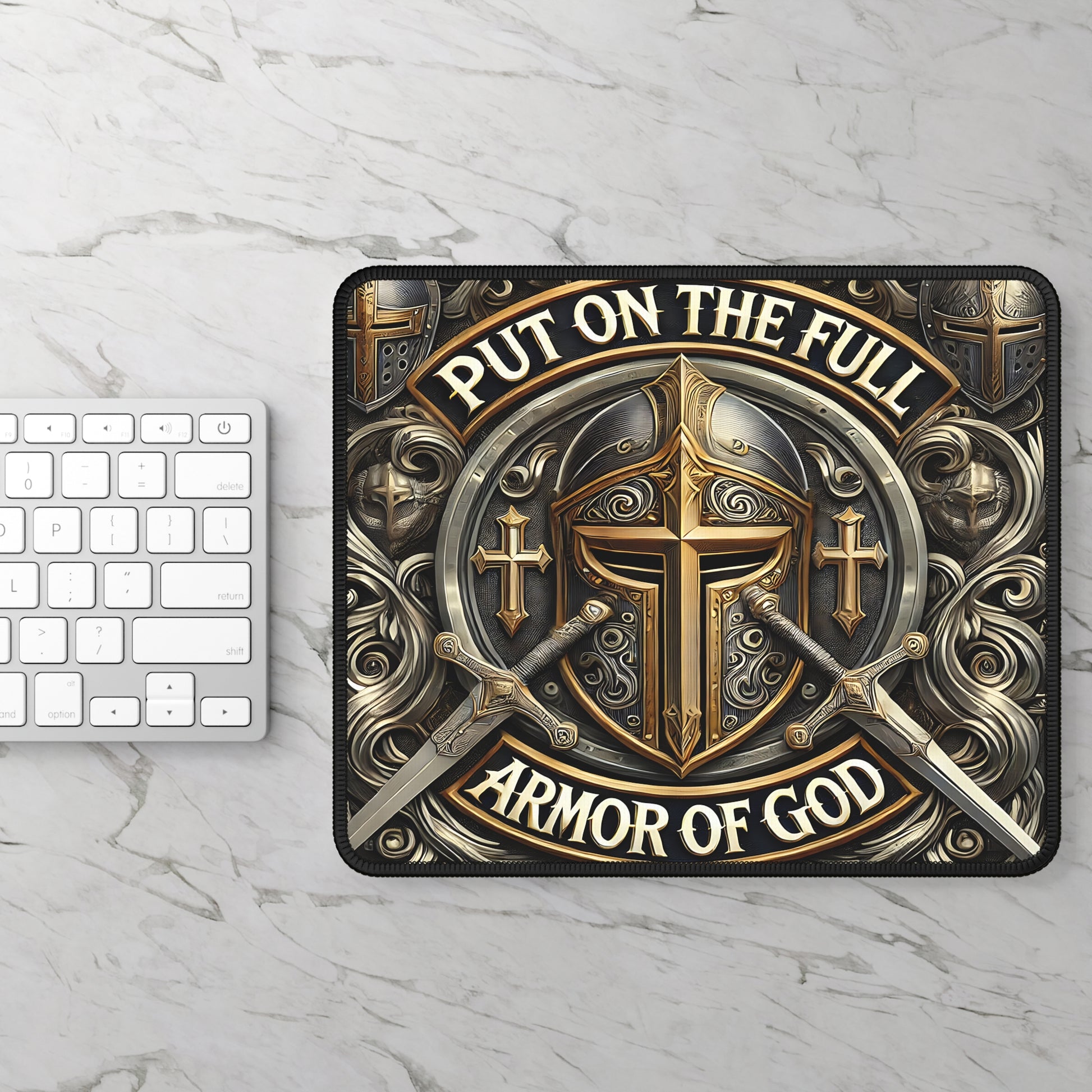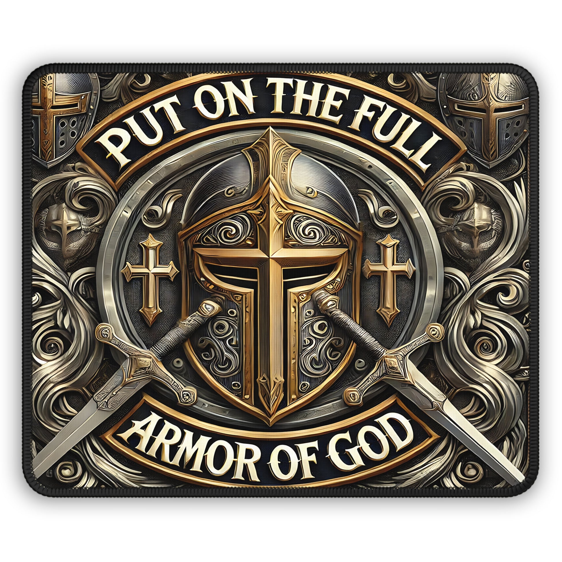 Stand firm and armor up your workspace with the Armor of God Mouse Pad. Featuring a striking medieval-inspired shield, crossed swords, and bold metallic detailing, this design represents strength, faith, and spiritual readiness. The commanding phrase “Put On the Full Armor of God” anchors the artwork, making this mouse pad a daily reminder to move through life protected, confident, and unshaken.