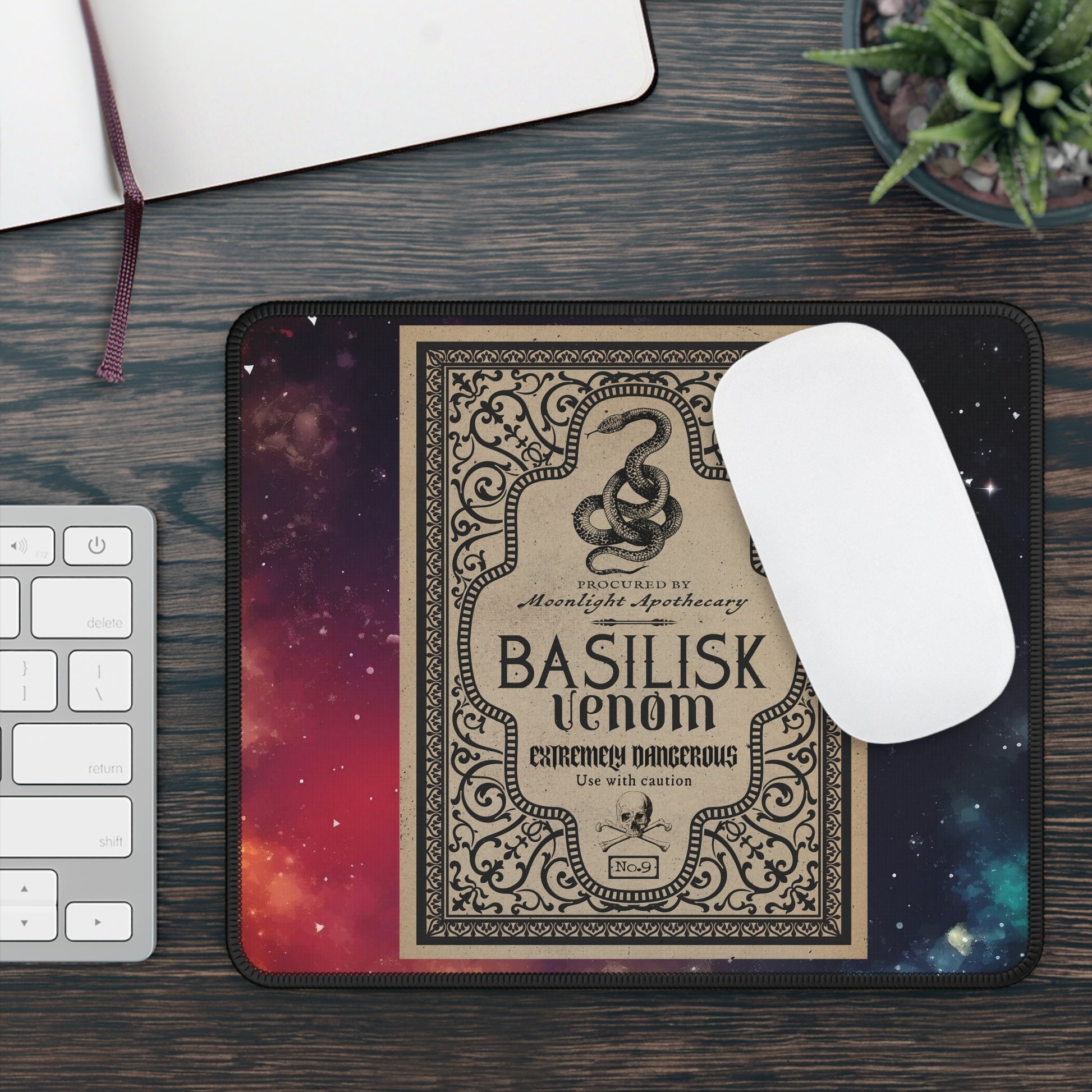 Unleash ancient legend and forbidden alchemy at your desk with the Basilisk Venom Mouse Pad. Featuring a vintage-style apothecary label warning of mythical danger, this design channels dark fantasy lore and old-world potion aesthetics against a cosmic night backdrop. A bold statement piece for those who prefer their workspace with a touch of peril.