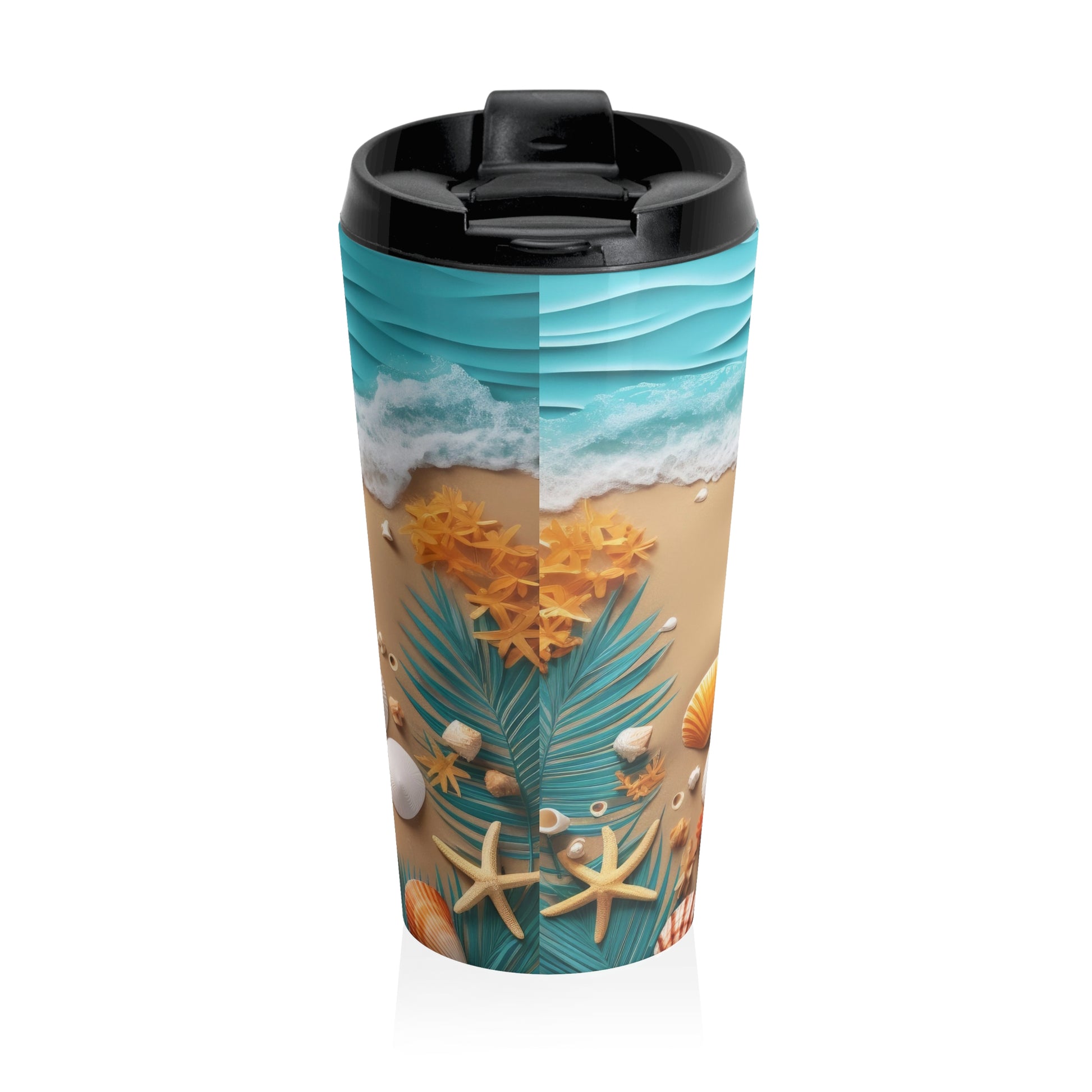 Let every sip take you seaside! This beautiful 15oz Stainless Steel Travel Mug brings the beach straight to your hands, featuring soft rolling waves, foamy surf, and a sandy shore sprinkled with shells, starfish, and warm tropical accents. It is the perfect escape for ocean lovers who want summer vibes all year long.