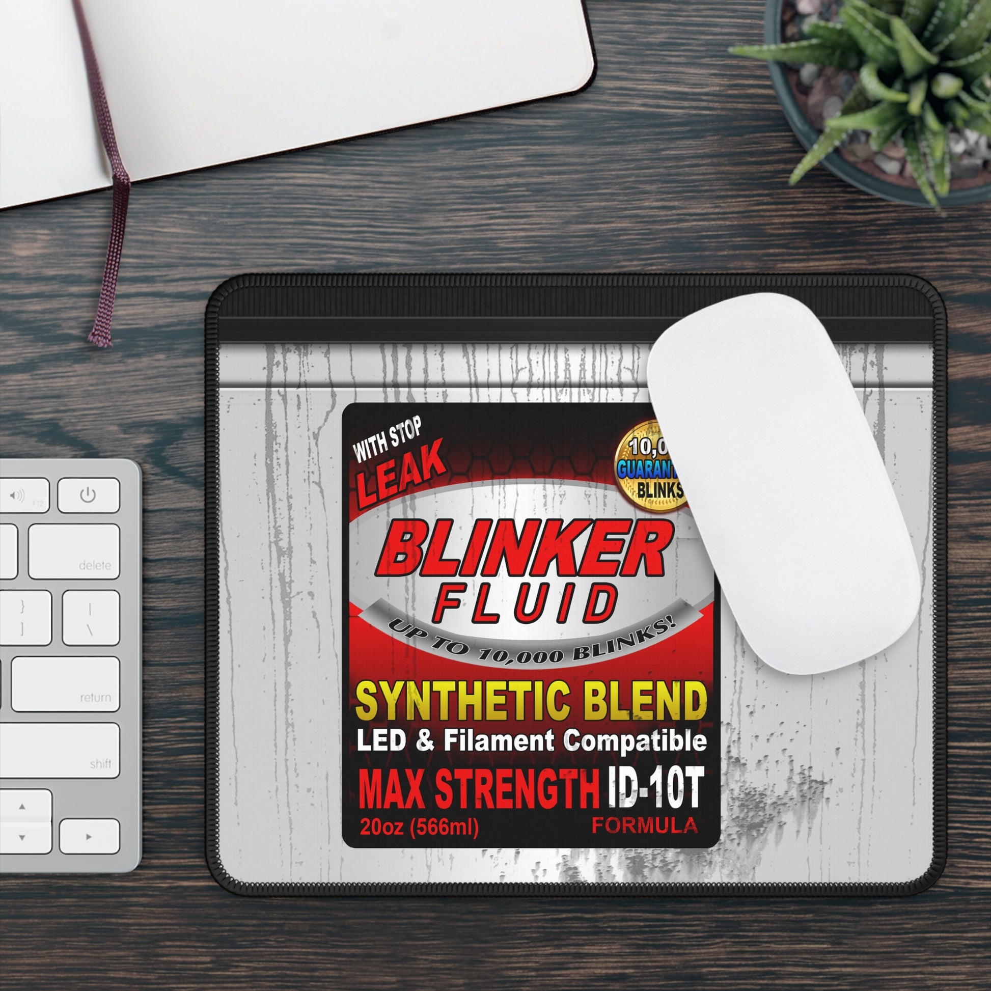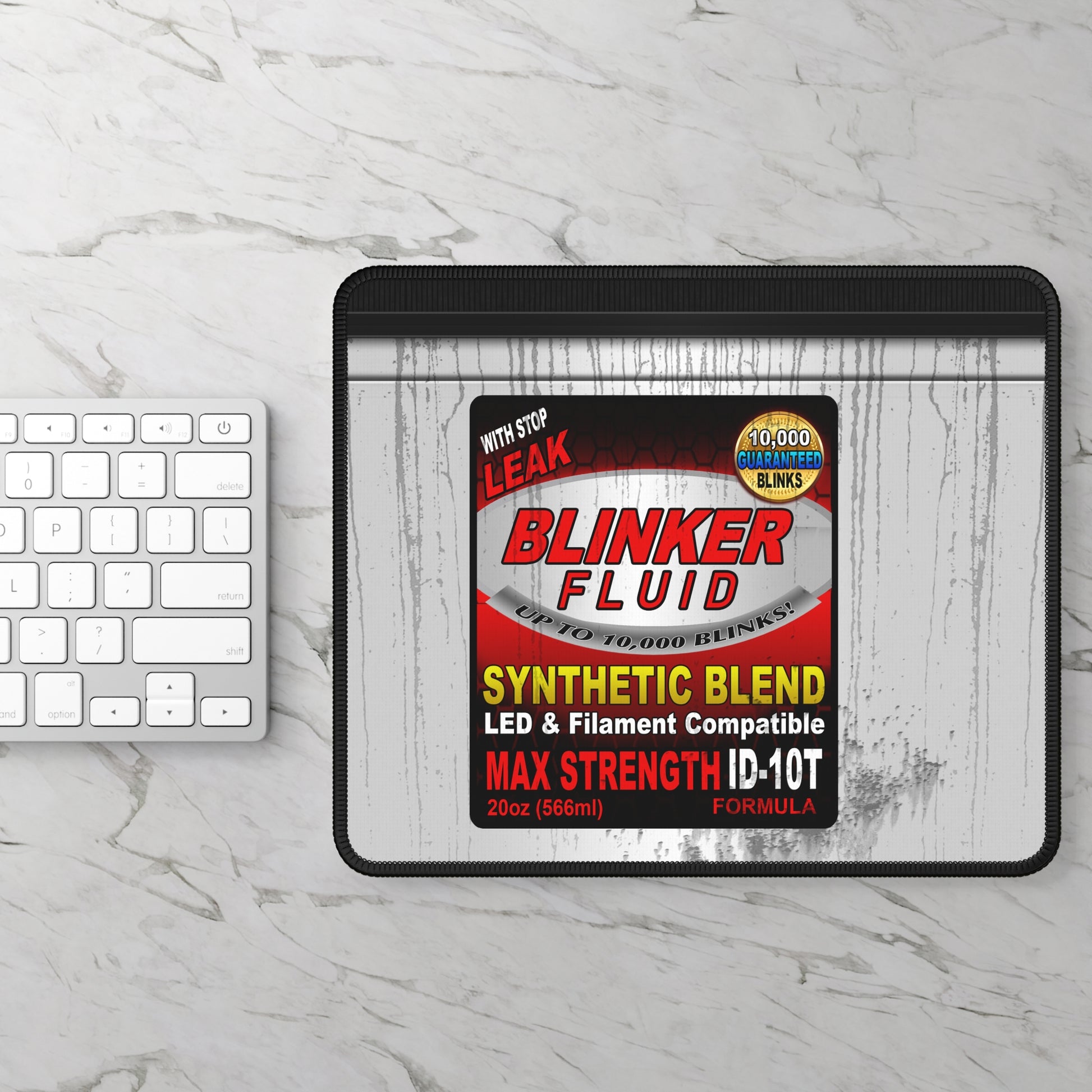 Blinker fluid parody mouse pad featuring automotive joke label design, gritty industrial texture, red and black car-themed graphics, and humorous mechanic-inspired desk mat artwork