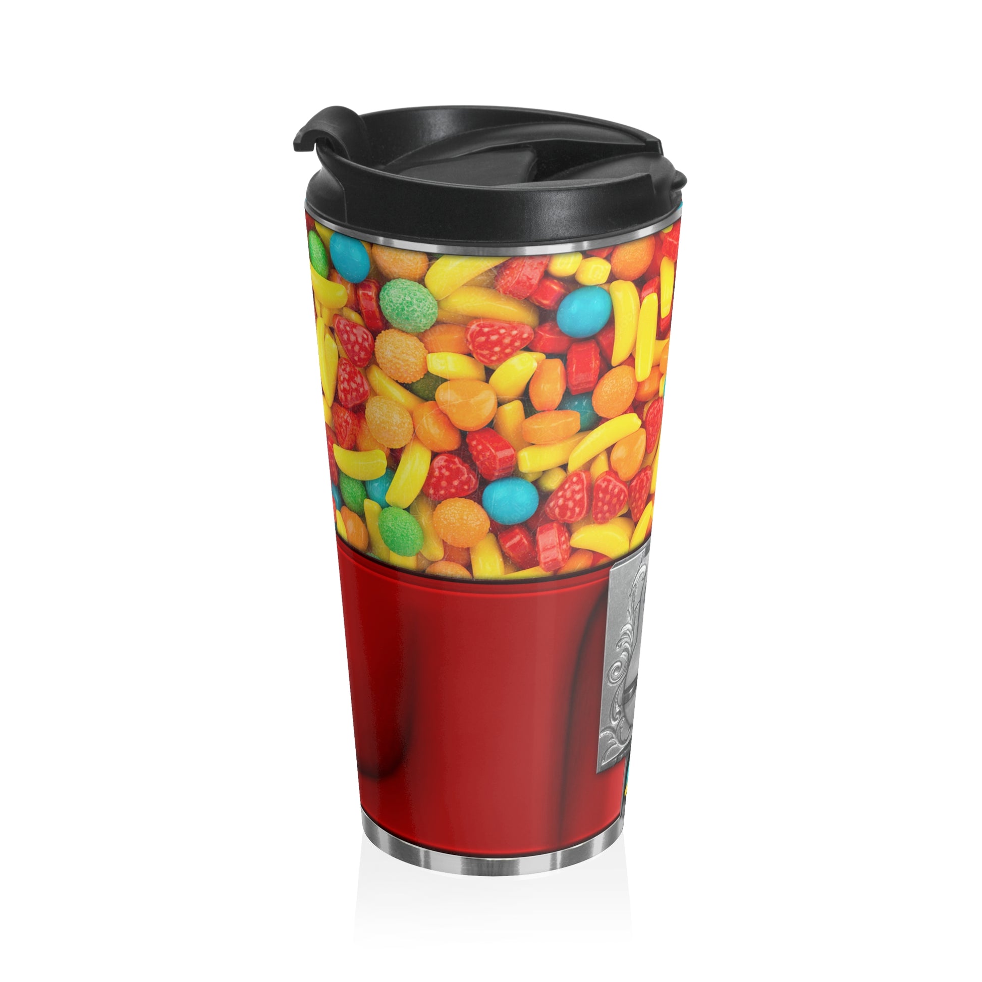 candy dispenser mug, capsule candy tumbler, colorful candy travel mug, vintage vending machine mug, novelty drinkware, fun coffee cup, retro candy design, bright colorful tumbler, playful mug gift, sweet tooth drinkware