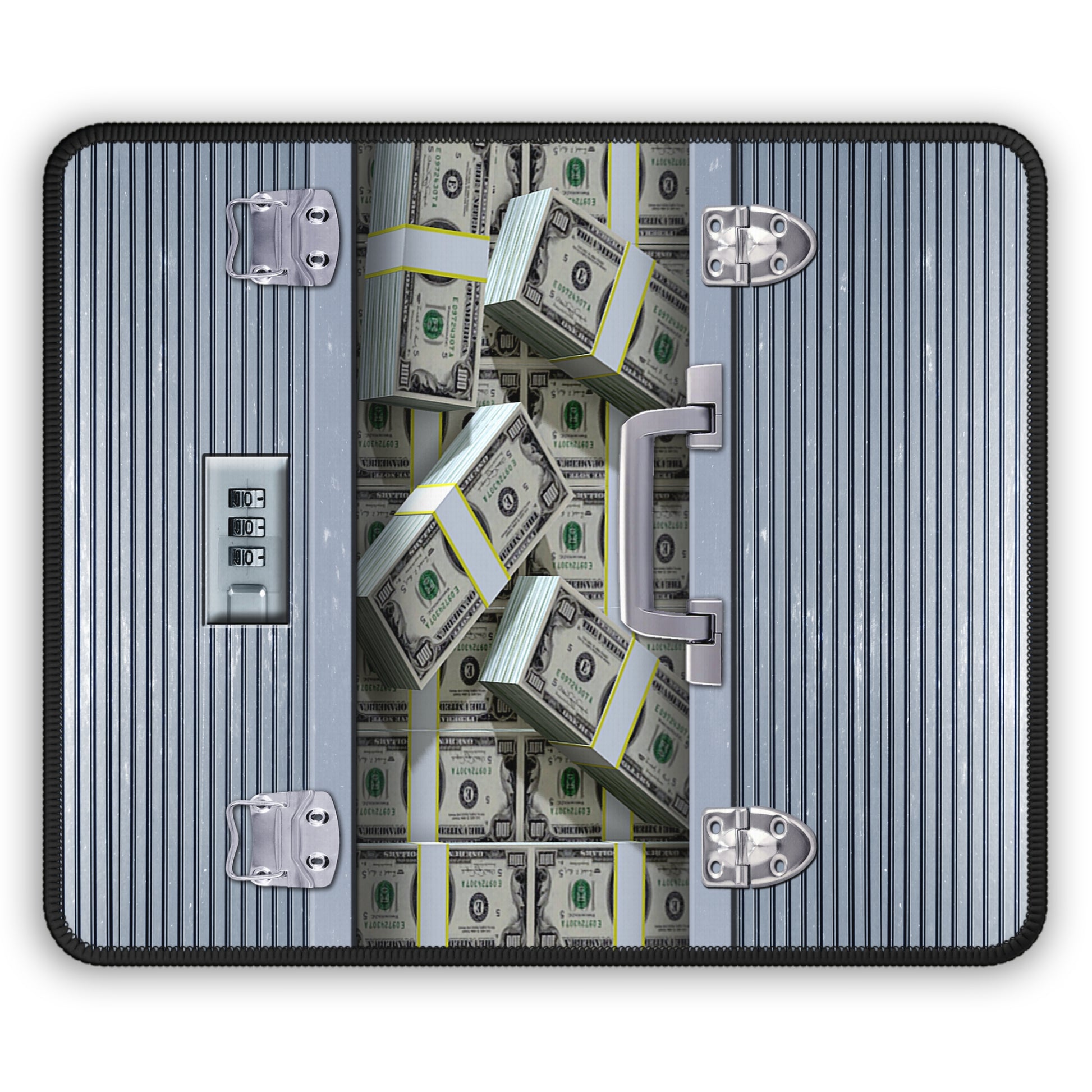 Open the door to pure desk-daydream fuel. This Gaming and Work Mouse Pad features a realistic vault-style case bursting with stacks of cash, wrapped bills, and industrial metal textures that scream high-stakes energy. It’s bold, playful, and just flashy enough to make your workspace feel like a heist movie freeze-frame — minus the risk.