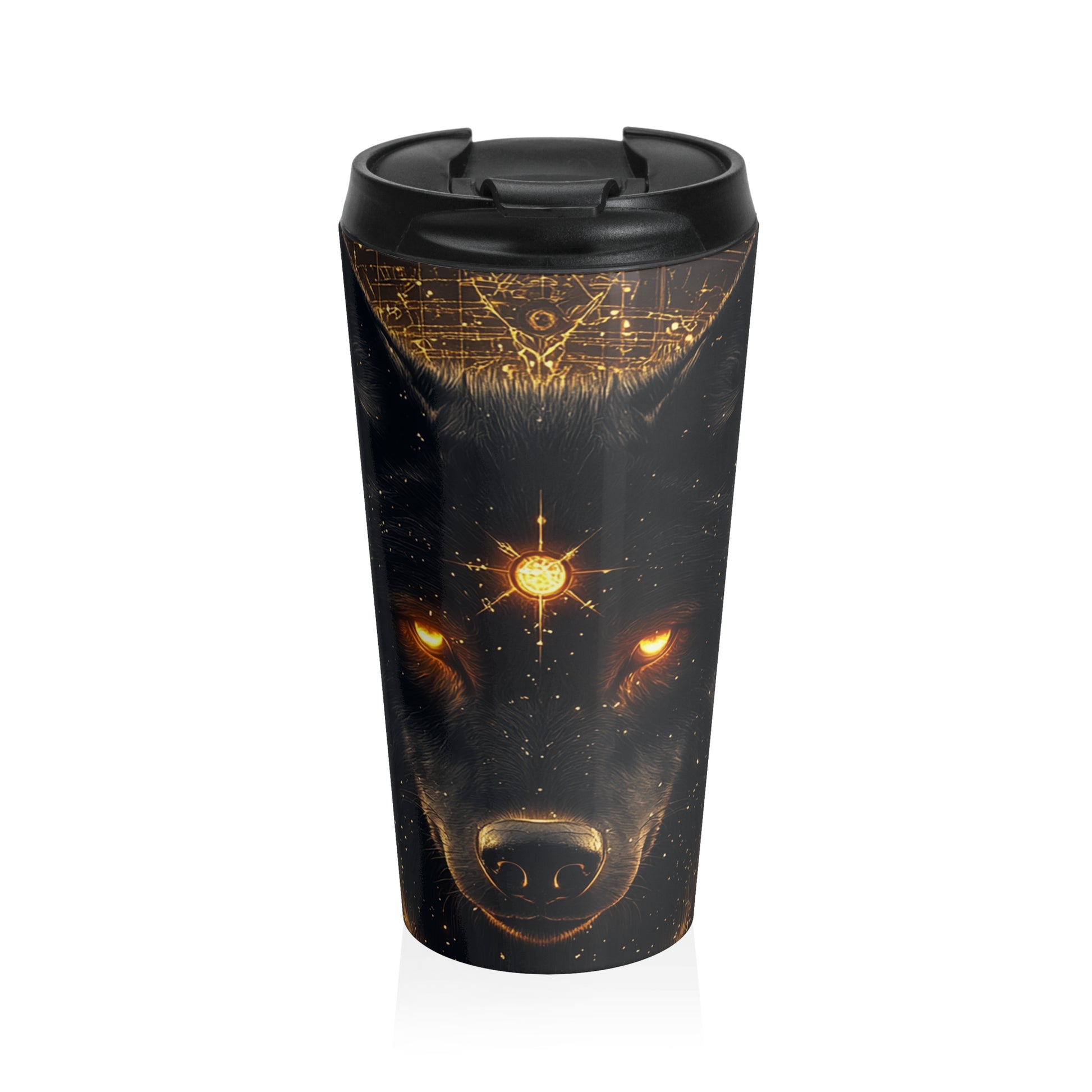Channel mystic energy with the Celestial Wolf Travel Mug — a stunning design featuring a glowing, cosmic wolf crowned with radiant golden markings. This fierce, otherworldly creature seems to stare straight into your soul, guiding you with ancient wisdom (or at least keeping your coffee safe).