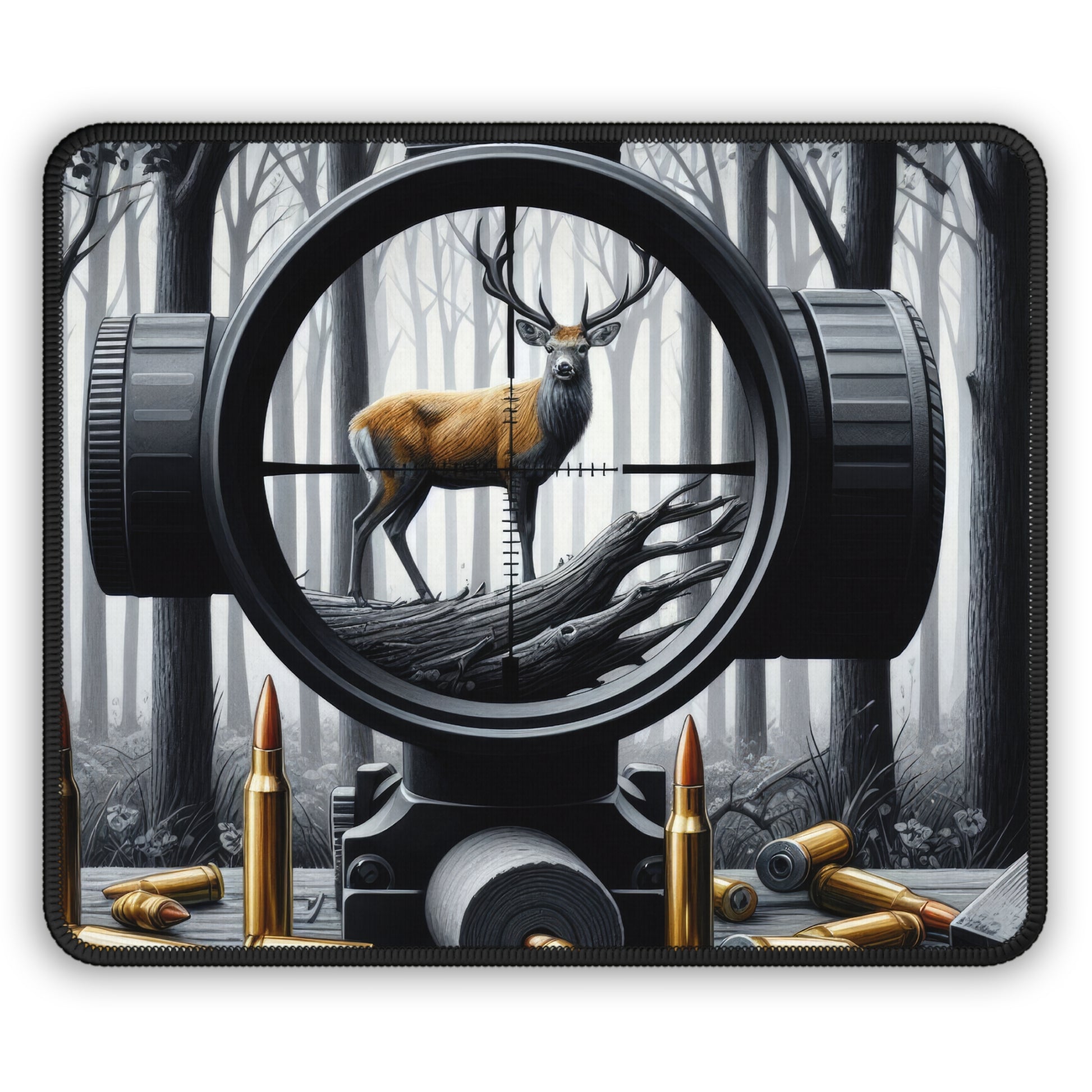 Bring calm, precision, and focus to your desk with this striking hunting-inspired mouse pad. Featuring a powerful stag framed perfectly inside a rifle scope, set against a quiet winter forest, this design captures patience, discipline, and steady control. The muted tones and detailed composition make it a bold yet refined piece for hunters, outdoorsmen, and anyone who values focus and accuracy in their workspace.