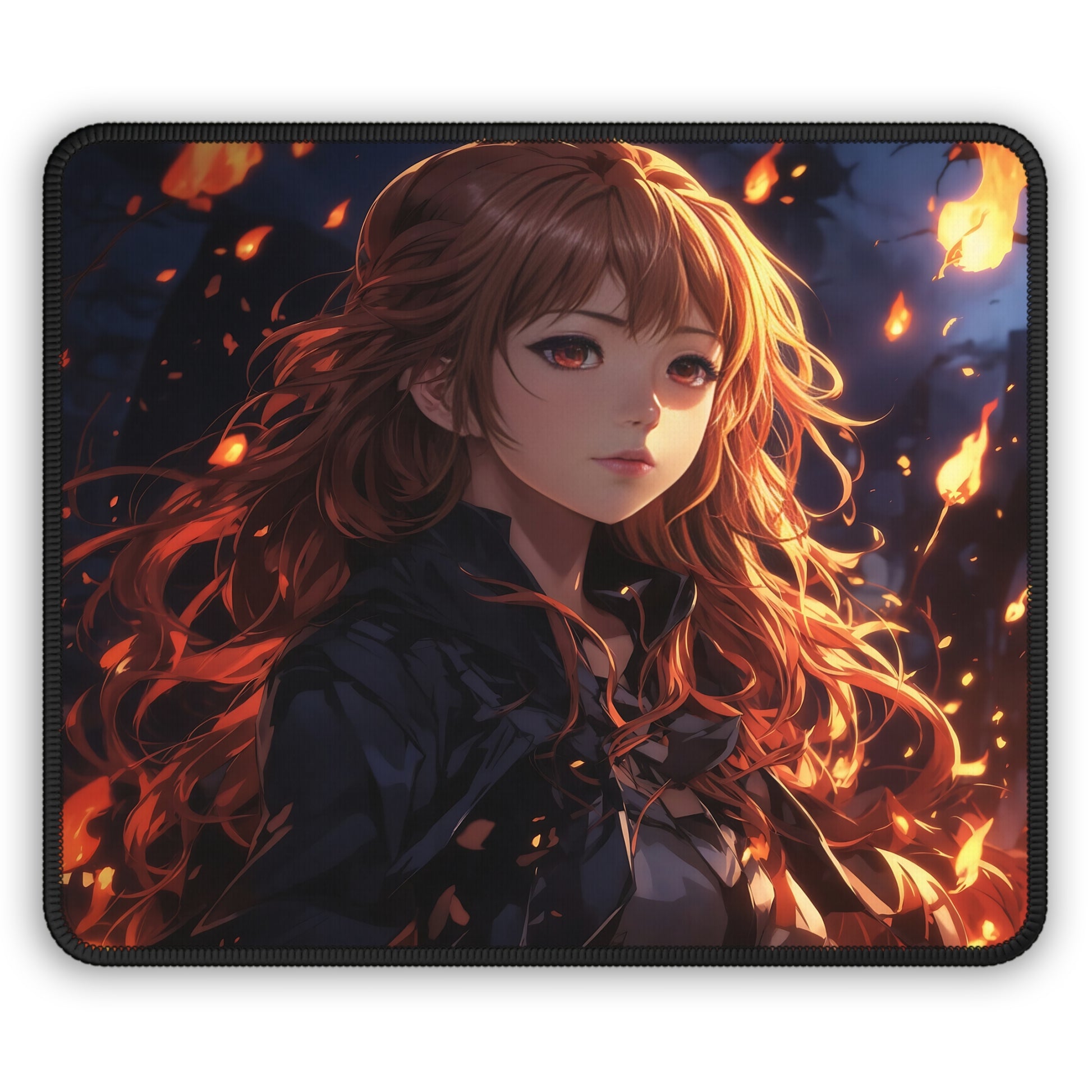 Ignite your workspace with this stunning, cinematic mouse pad featuring a fiery-haired muse surrounded by drifting embers and warm, glowing light. With rich autumn tones, flowing motion, and a calm yet powerful presence, this design brings a sense of focus, creativity, and quiet strength to your desk. Perfect for gamers, artists, and anyone who loves dramatic fantasy-inspired aesthetics without saying a word.