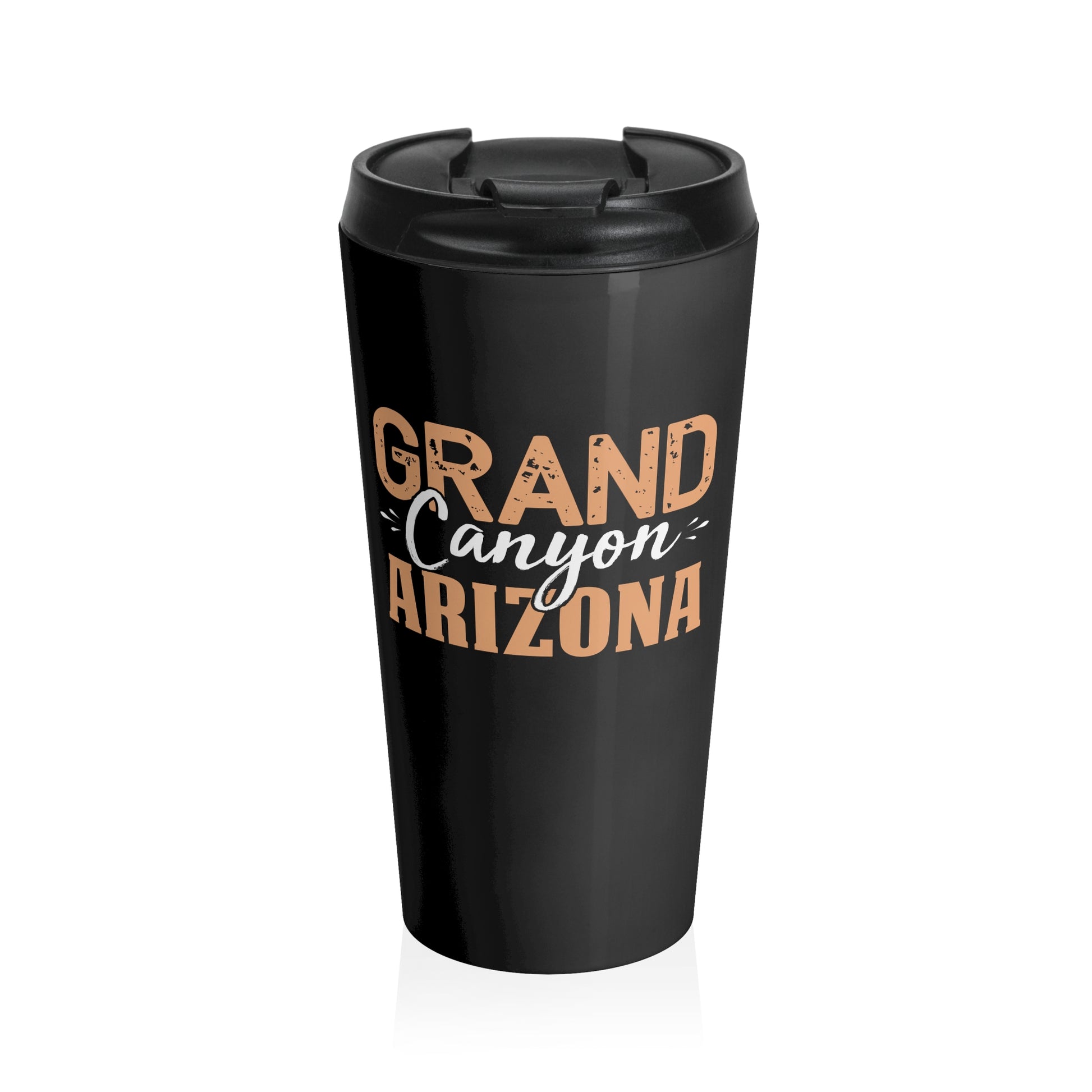 15oz Stainless Steel Travel Mug with “Grand Canyon Arizona” text in tan and white on a black background.