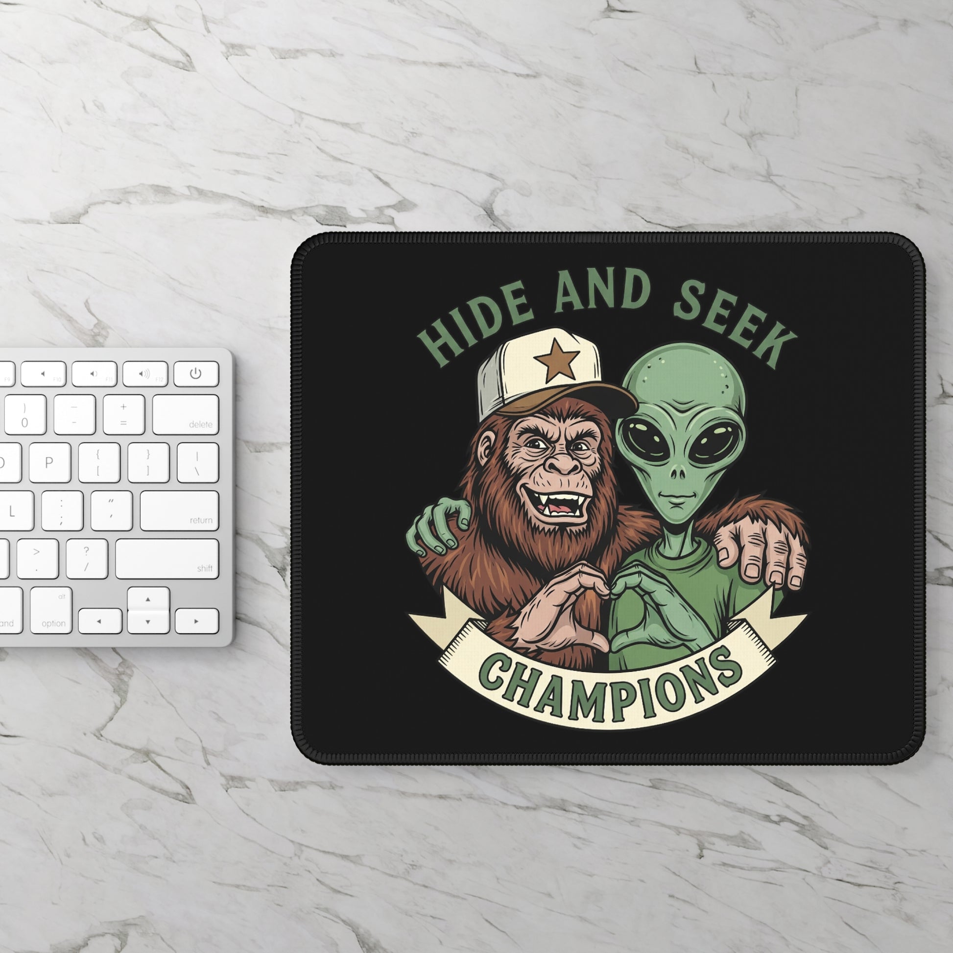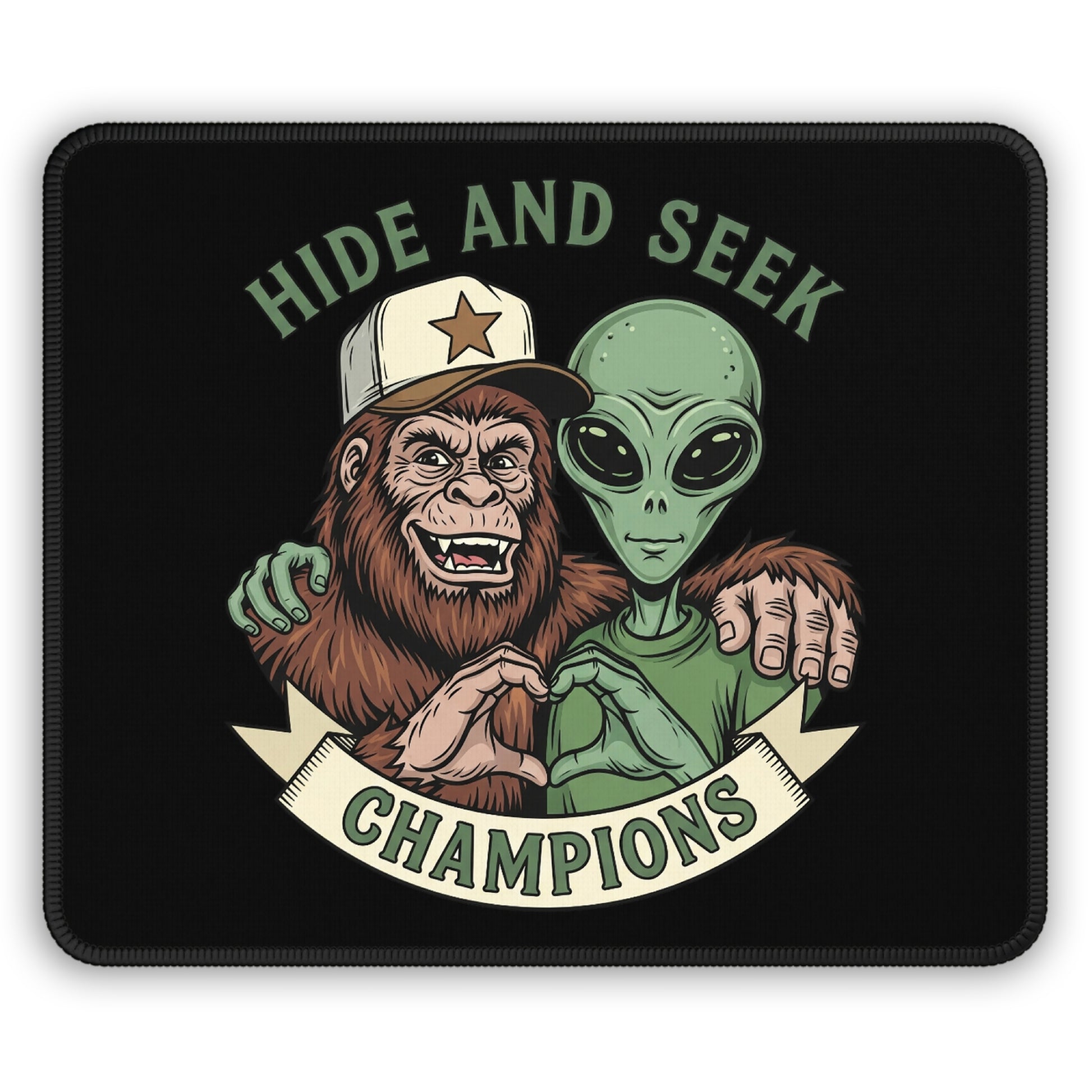 hide and seek champions mouse pad, bigfoot alien mouse pad, funny cryptid desk mat, sci fi gaming mouse pad, neoprene 9x7 mouse pad, geek desk decor, novelty gamer gift, WackyGiftShop mouse pad