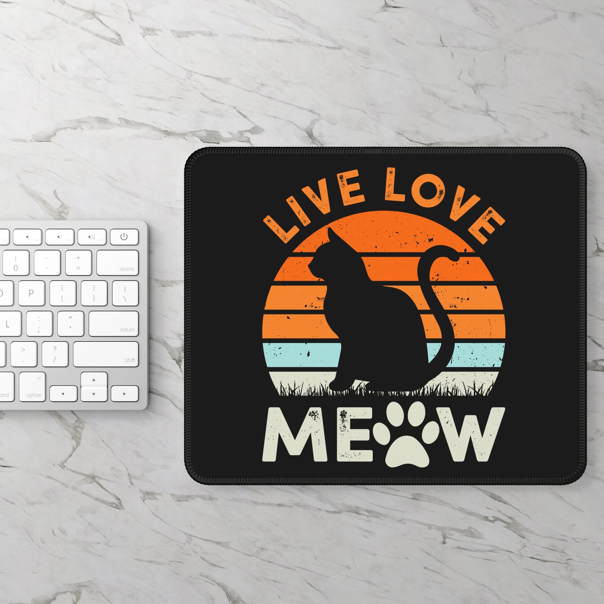 Add cozy cat energy to your desk with the Live Love Meow Mouse Pad. Featuring a bold black background, a vintage sunset stripe design, and a sleek cat silhouette paired with playful paw-print lettering, this mouse pad is perfect for cat lovers who want their workspace to reflect their personality. Equal parts retro, cute, and confident — it’s a statement piece for any desk setup.