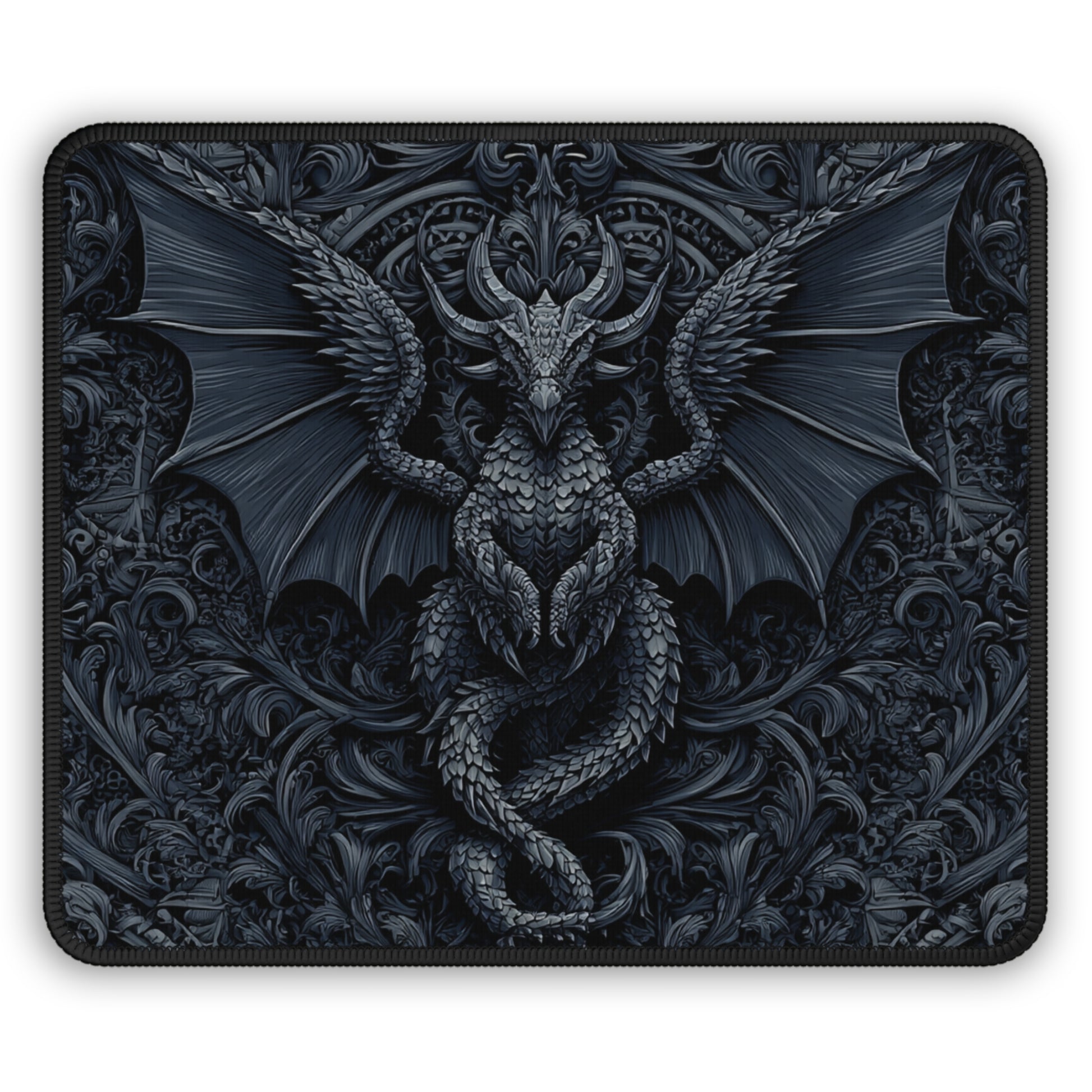 Summon pure shadow and ancient dominance to your desk. The Midnight Obsidian Dragon Mouse Pad showcases a powerful winged dragon sculpted in deep charcoal tones, wrapped in ornate gothic filigree. Every scale, curve, and wingbeat feels carved from darkness itself — elegant, intimidating, and impossibly cool.