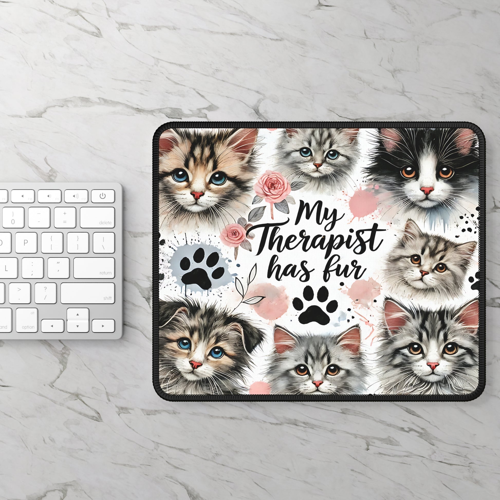 The My Therapist Has Fur Mouse Pad features a heart-melting collage of fluffy cats, soft watercolor accents, paw prints, and comforting vibes that instantly calm your workspace. It’s cozy, emotional-support energy — without the copay.