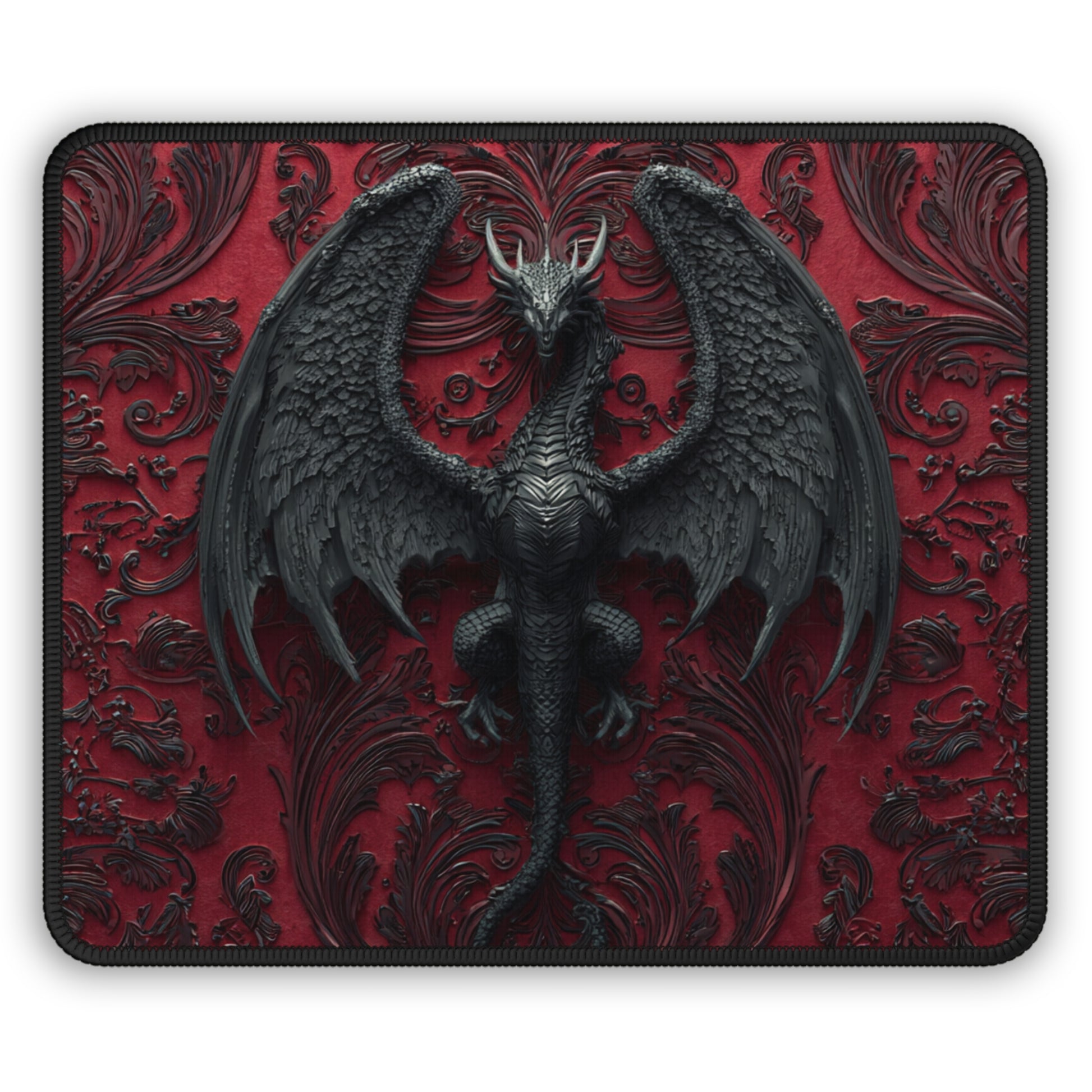 Command the desk with ancient power. The Obsidian Wing Dragon Mouse Pad features a majestic black dragon with massive outstretched wings, set against a deep crimson ornamental backdrop. Dark, elegant, and intimidating — this design radiates dominance, mystery, and timeless fantasy strength.