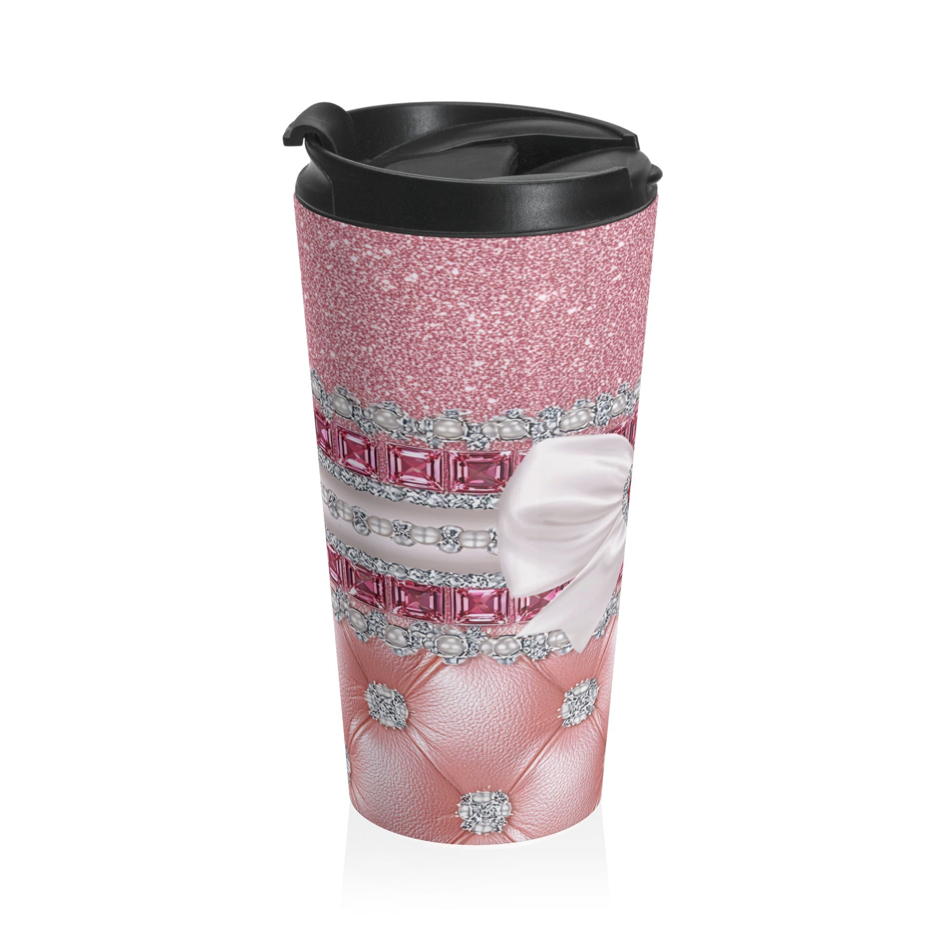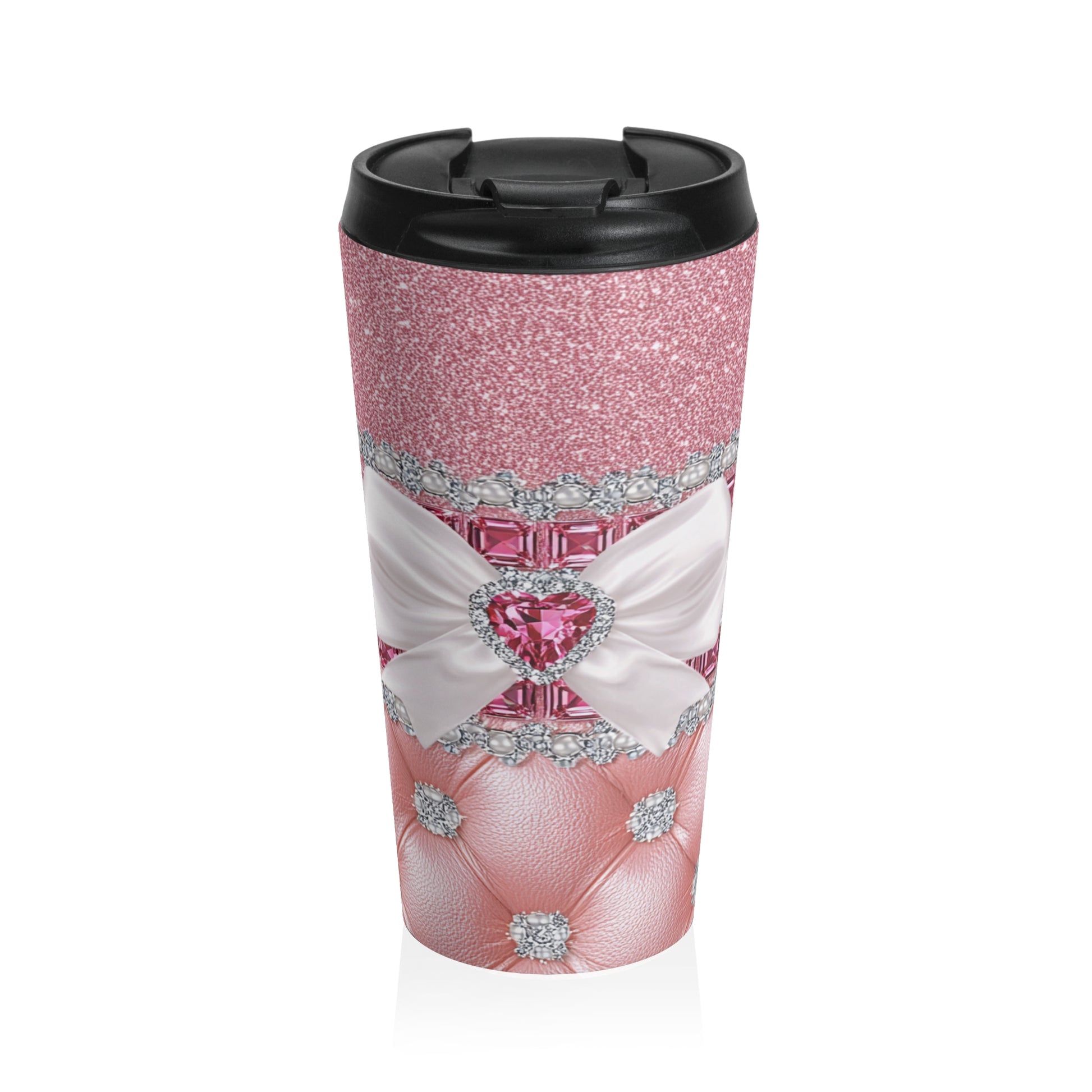 Luxury meets everyday caffeine with this stunning Stainless Steel Travel Mug. Featuring shimmering pink glitter textures, tufted leather-inspired accents, sparkling crystal details, and an elegant bow with a heart-shaped jewel centerpiece, this design is pure glam from top to bottom. It’s bold, classy, and unapologetically fabulous — perfect for anyone who likes their coffee served with sparkle.