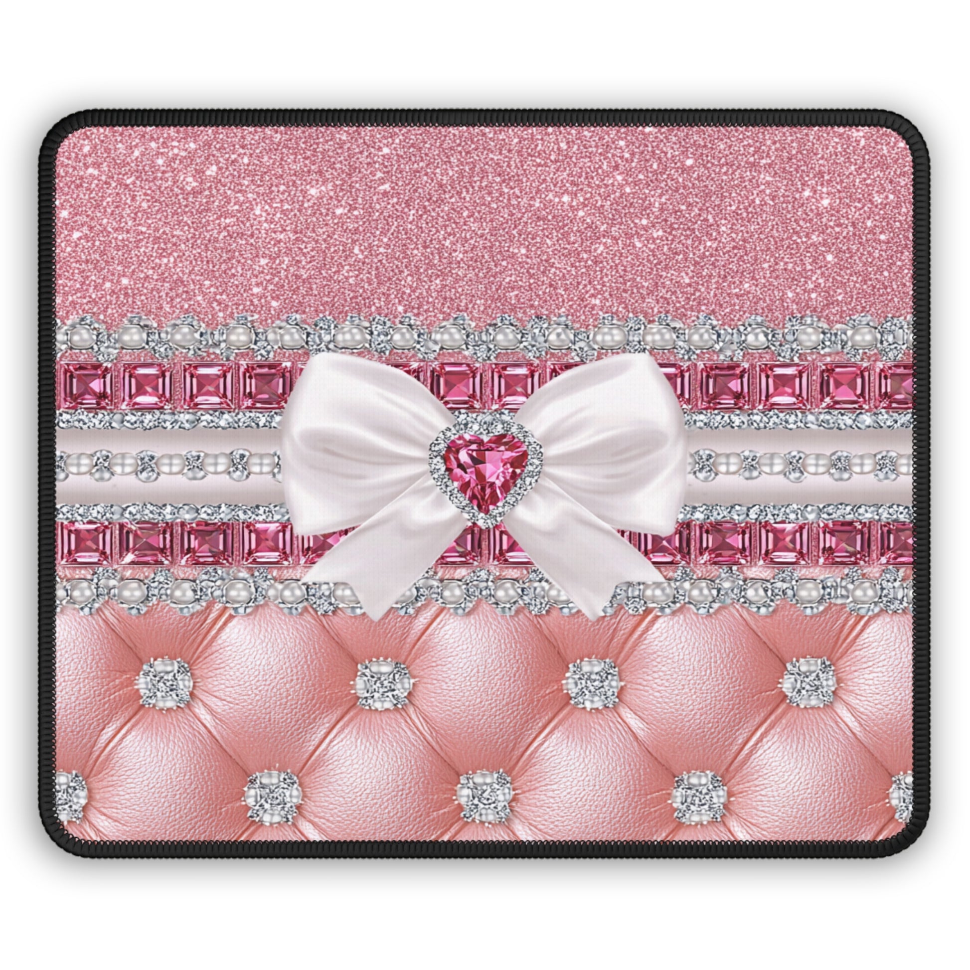 Turn your workspace into a glam dream with this elegant Gaming and Work Mouse Pad. Featuring a shimmering pink glitter backdrop, layered rhinestone and pearl bands, and a soft satin bow crowned with a heart-shaped jewel, this design delivers boutique-level sparkle with cozy, feminine charm. It’s the perfect blend of luxury and comfort for workdays, gaming nights, and everything in between.