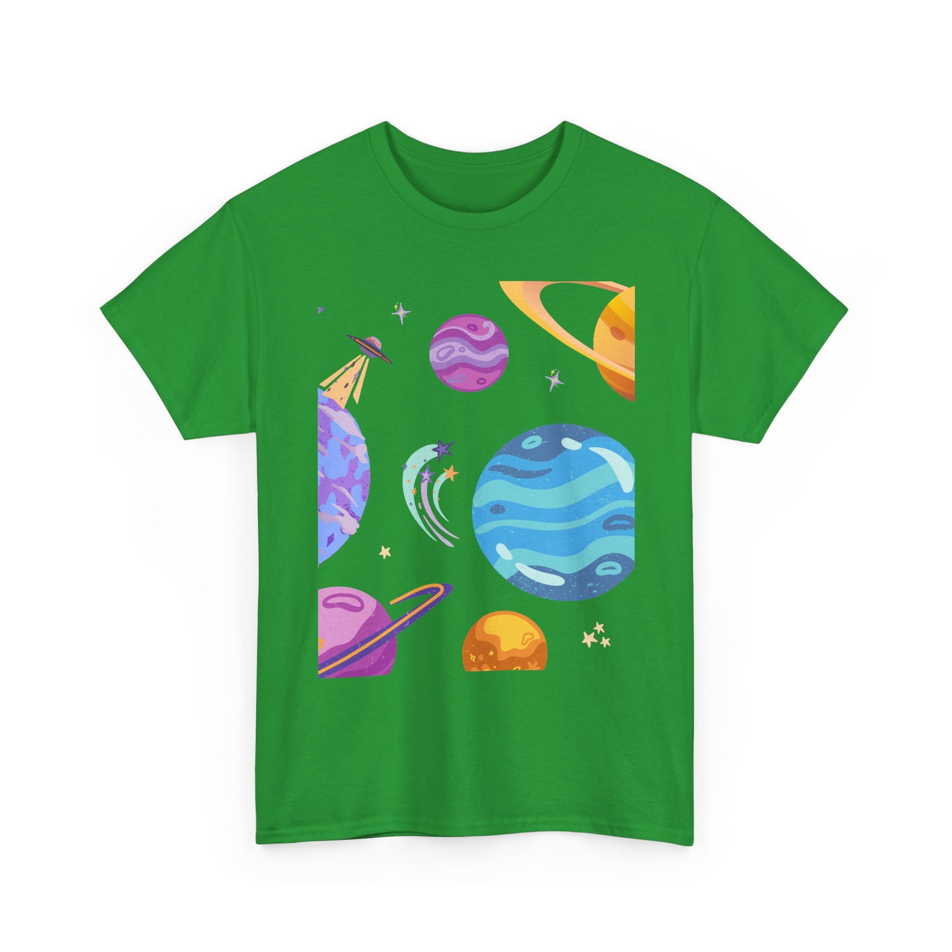 Explore the galaxy in style with our Planetary Dream Heavy Cotton Tee! Featuring a colorful and whimsical outer-space design, this shirt is perfect for stargazers, dreamers, and cosmic adventurers. Made from 100% durable cotton, it offers comfort that lasts light-years. The vibrant print pops against the soft fabric, making it a fun addition to any wardrobe.