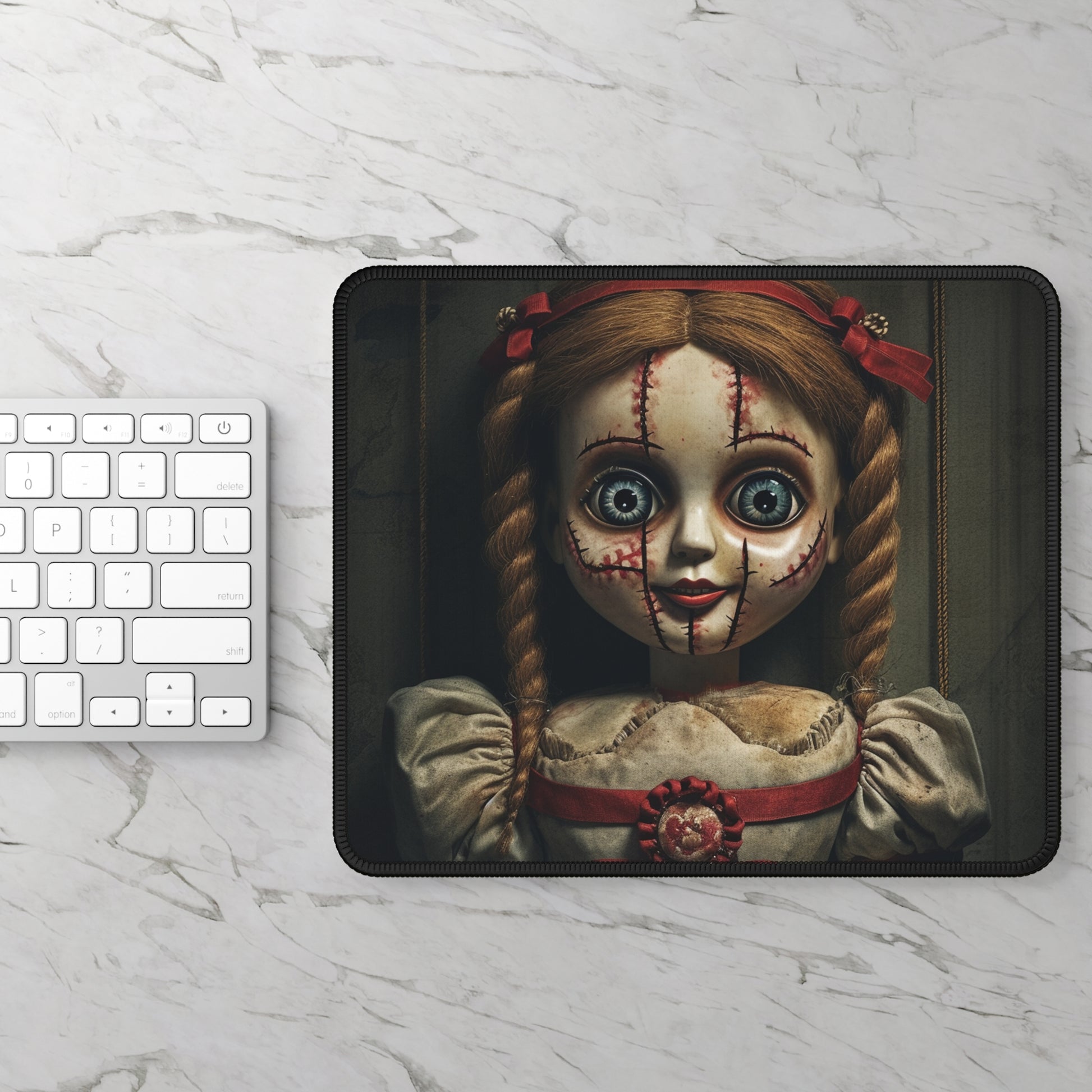 creepy doll mouse pad, stitched doll desk mat, porcelain doll mouse pad, horror doll gaming mouse pad, gothic doll desk mat, spooky doll mouse pad, haunted toy desk mat, WackyGiftShop horror mouse pad