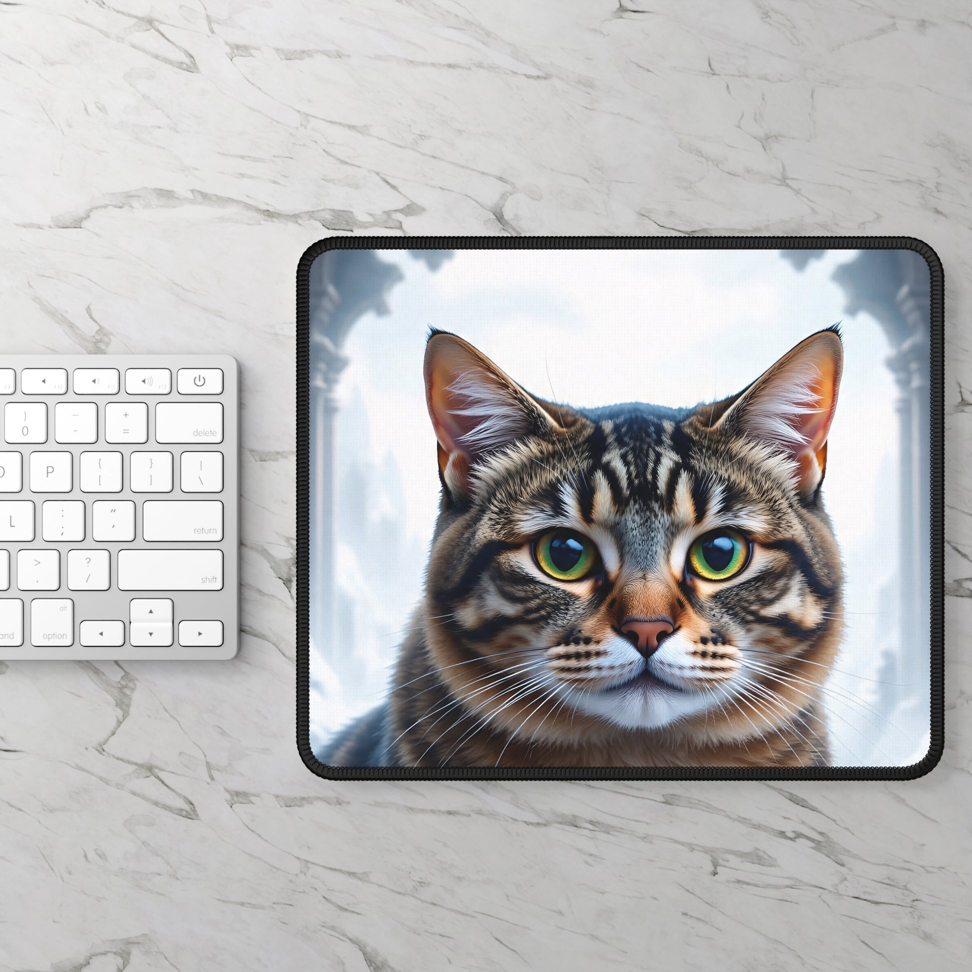 Lock eyes with elegance. The Regal Green-Eyed Cat Mouse Pad features a striking, hyper-detailed feline portrait with piercing green eyes and perfectly balanced symmetry. Framed by a soft, airy background, this design brings calm confidence, quiet power, and a touch of mystery to your desk. It’s refined, captivating, and impossible to ignore.