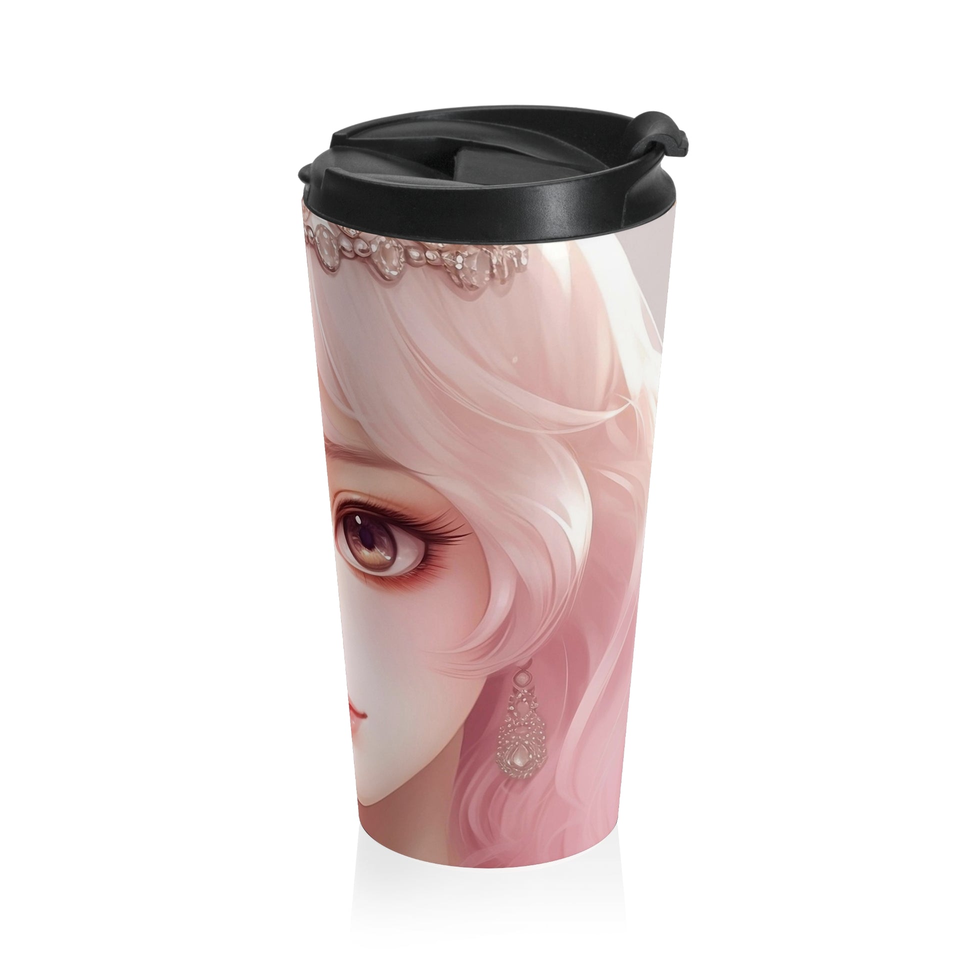rose aesthetic travel mug, pastel anime mug, pink character tumbler, soft aesthetic drinkware, stainless steel 15oz mug, kawaii style mug, delicate artwork cup, WackyGiftShop travel mug, dreamy pastel tumbler, feminine aesthetic mug