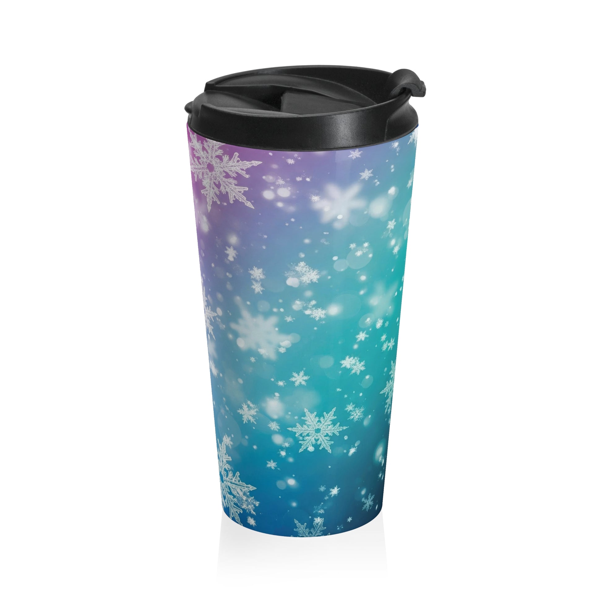 snowflake travel mug, winter stainless steel mug, pastel snowflake cup, holiday gift mug, insulated drinkware, purple blue gradient design, 15oz travel tumbler, cozy winter coffee cup, cute seasonal drinkware, WackyGiftShop winter collection