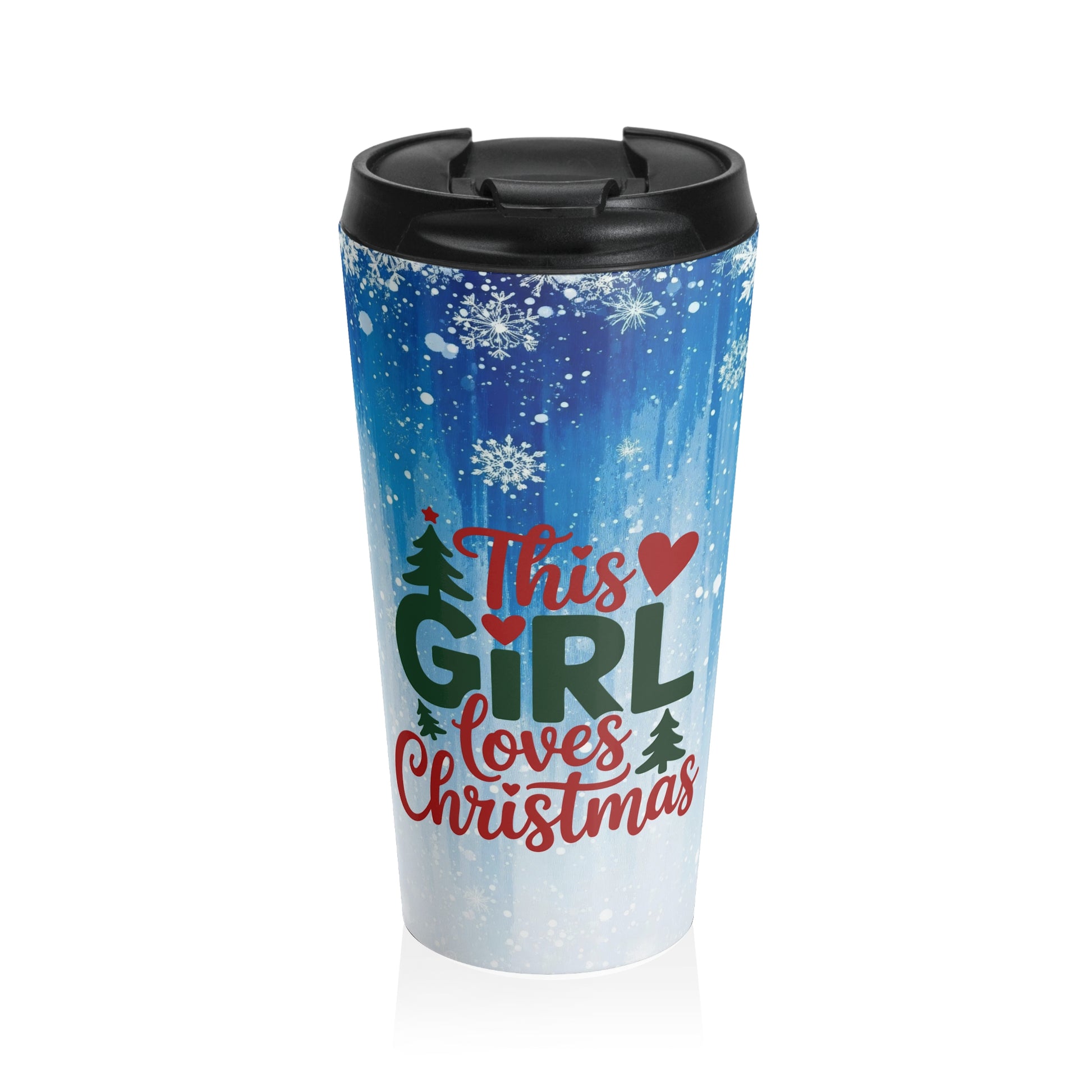 Celebrate the season in style with the This Girl Loves Christmas Travel Mug — a cheerful winter design featuring snowy blue skies, twinkling snowflakes, festive Christmas trees, and vibrant holiday lettering. Perfect for the girl who counts down the days to December, loves holiday lights, and proudly sips cocoa year-round.