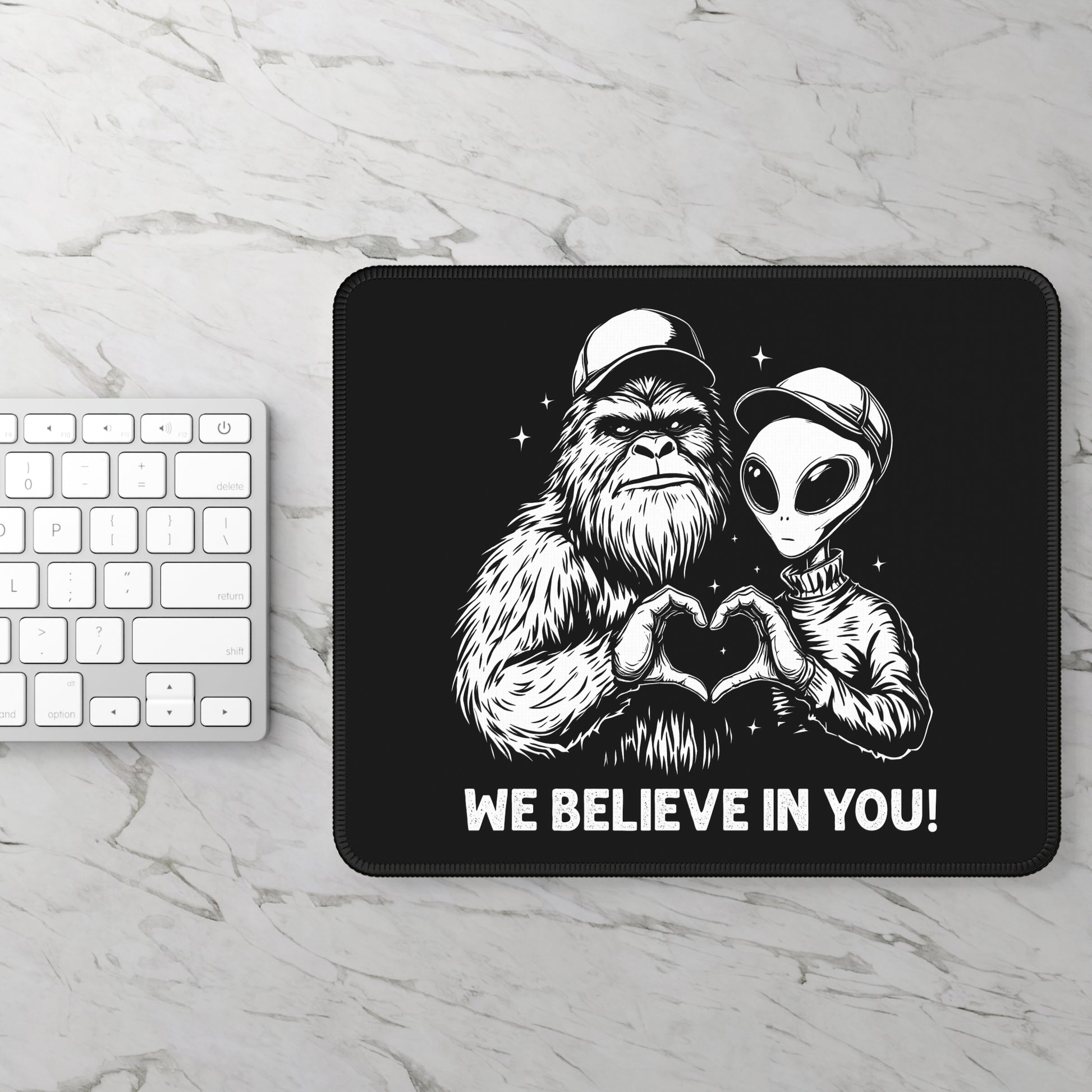 Bring encouragement, humor, and a little cosmic weirdness to your desk with this bold Gaming and Work Mouse Pad. Featuring a black-and-white illustration of a confident Bigfoot and a friendly alien forming a heart with their hands — topped off with the message “We Believe in You!” — this design is equal parts motivational and hilarious. Perfect for gamers, creatives, and anyone who needs a daily reminder that even cryptids are rooting for them.