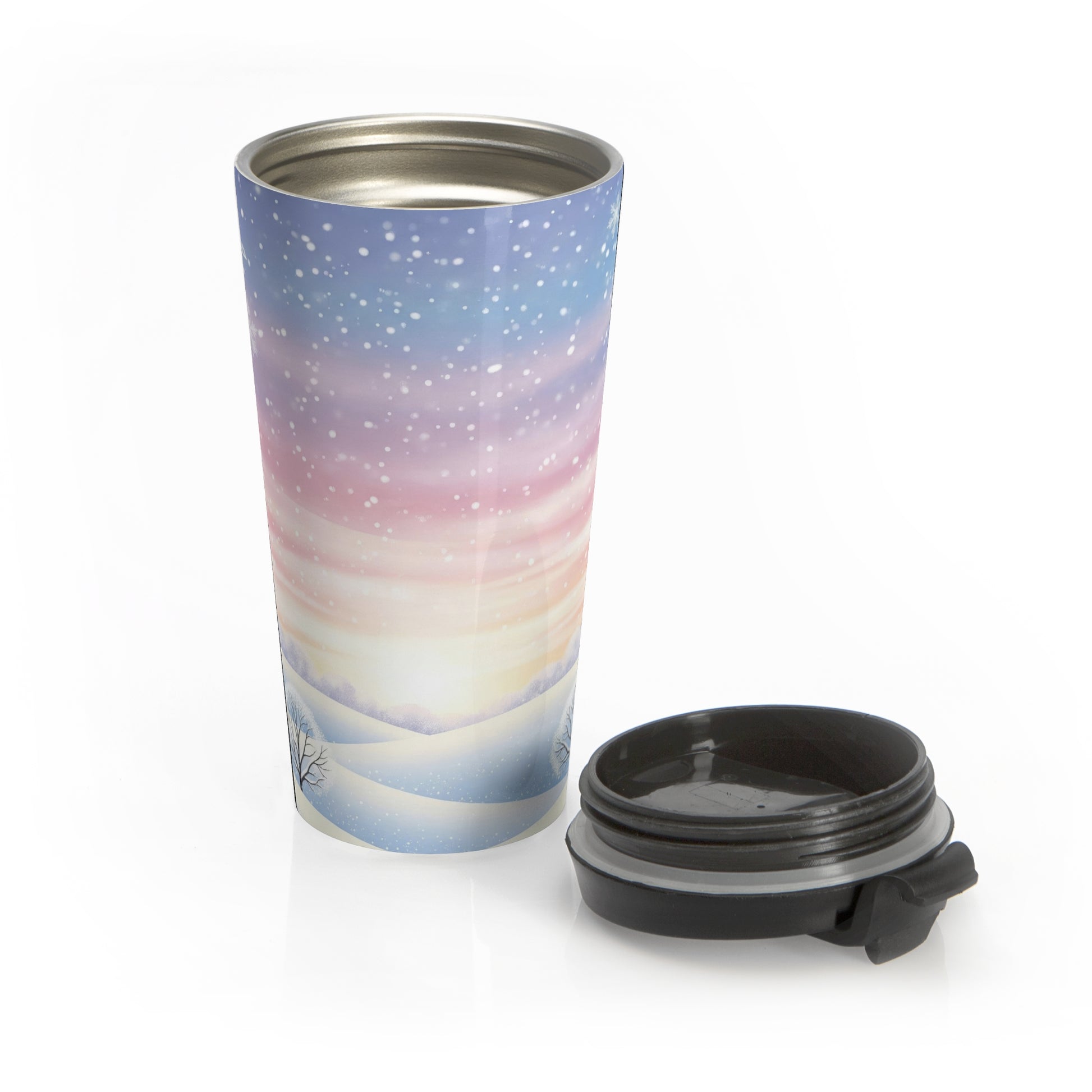 winter sunset travel mug, snow landscape stainless steel mug, pastel winter tumbler, scenic holiday drinkware, insulated 15oz travel mug, snowy nature coffee cup, aesthetic winter design, WackyGiftShop winter collection, calm winter art mug, seasonal stainless steel cup