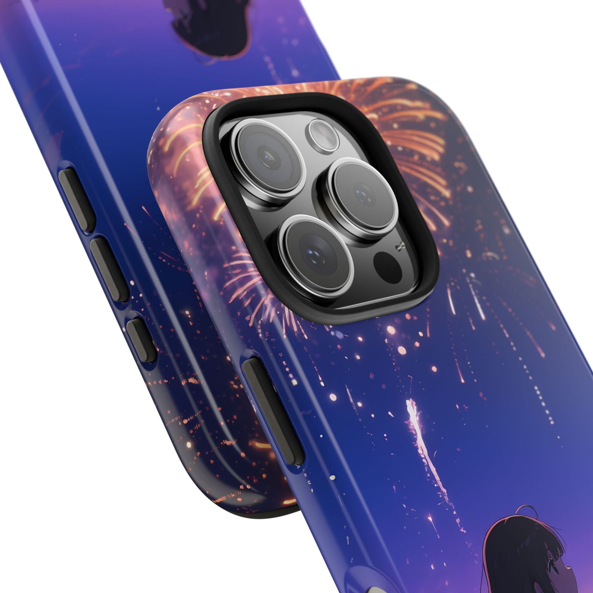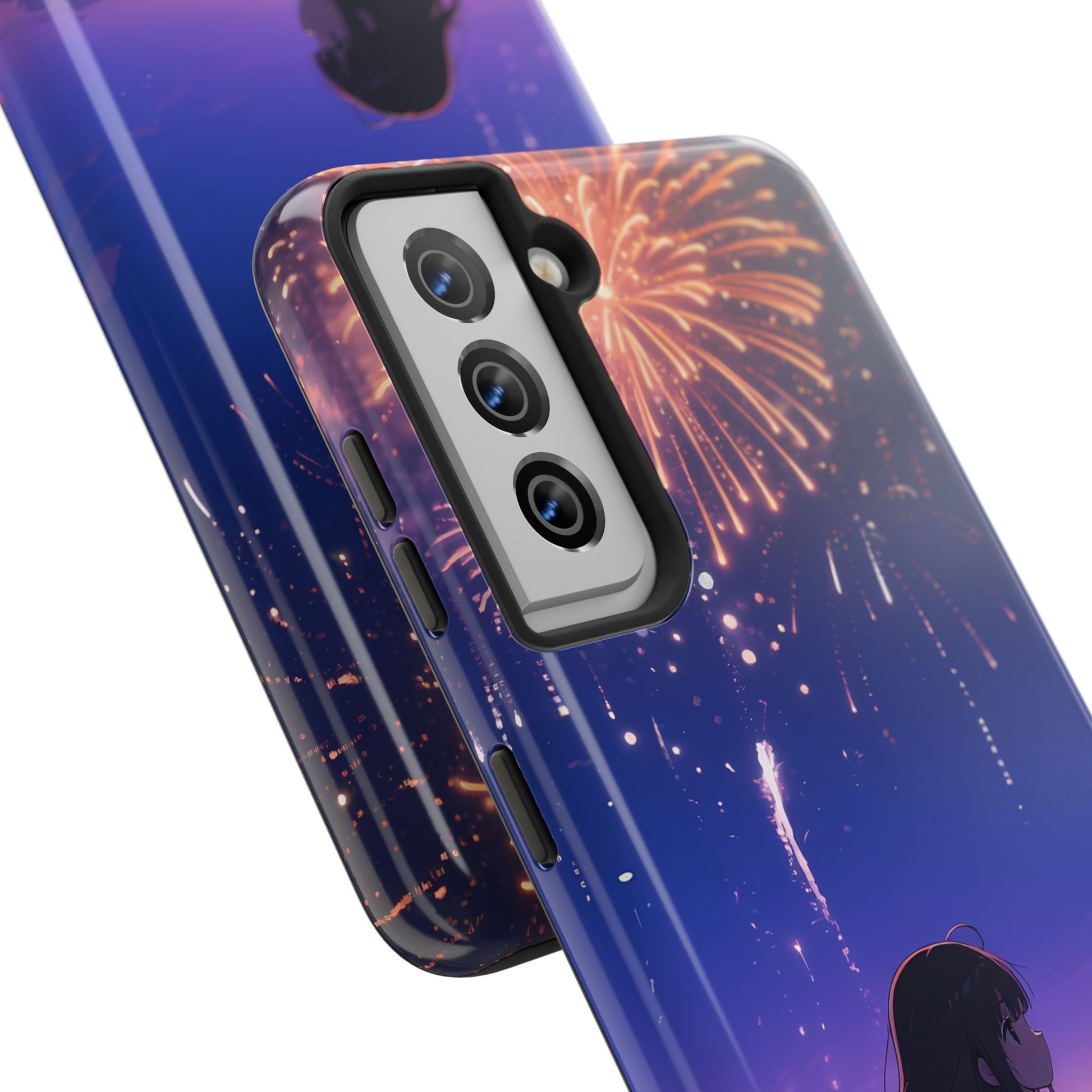 Carry a quiet summer night wherever you go. This slim, glossy phone case shows a lone figure watching fireworks over the sea — a moment of stillness and wonder captured in deep purples and warm bursts of light. It feels like stepping onto a shore at dusk: the air salty, the horizon soft, and the sky alive with color. For someone who treasures small, cinematic pauses — late-night walks, rooftop gatherings, seaside drives — this case keeps that mood close while protecting the phone. The artwork wraps the sides for a seamless look, and the glossy finish makes the colors sing under city lights or sunset glow.